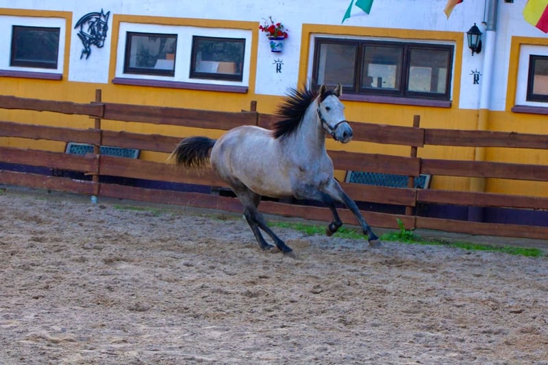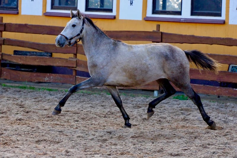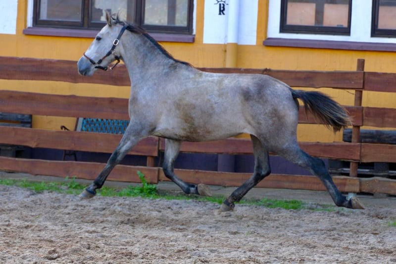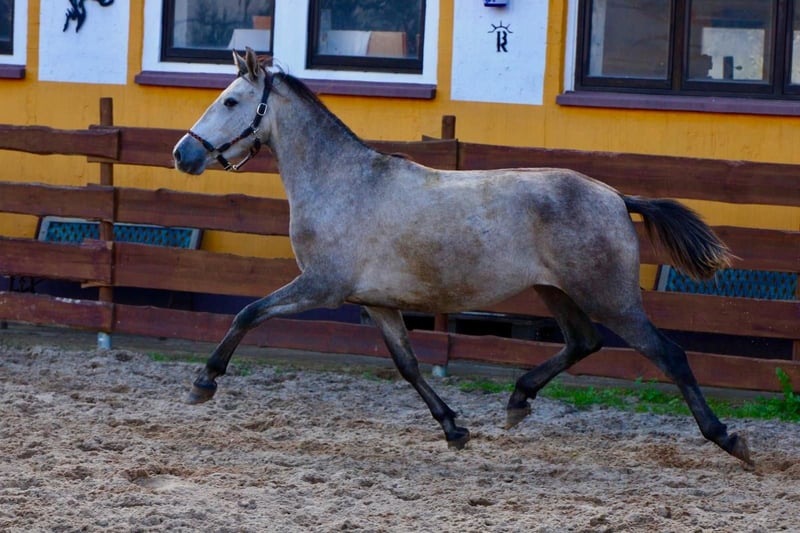 **Sales Advertisement: Beautiful PRE Mare for Sale** We offer a talented PRE mare for sale. **Features:** - **Breed:** PRE (Pura Raza Española) - **Gender:** Mare - **Year of Birth:** 2022 - **Color:** Apple Grey - **Height:** 160 cm - **Suitability:** Dressage This mare impresses with her charming character and her promising abilities in dressage. She is well-mannered, easy to handle, and already shows promising basic gaits. Her friendly nature makes her an ideal partner for riders who enjoy dressage. She has just turned 3 years old and is being cautiously lunged. If you are interested or have any further questions, we look forward to your message!