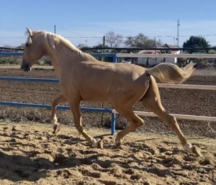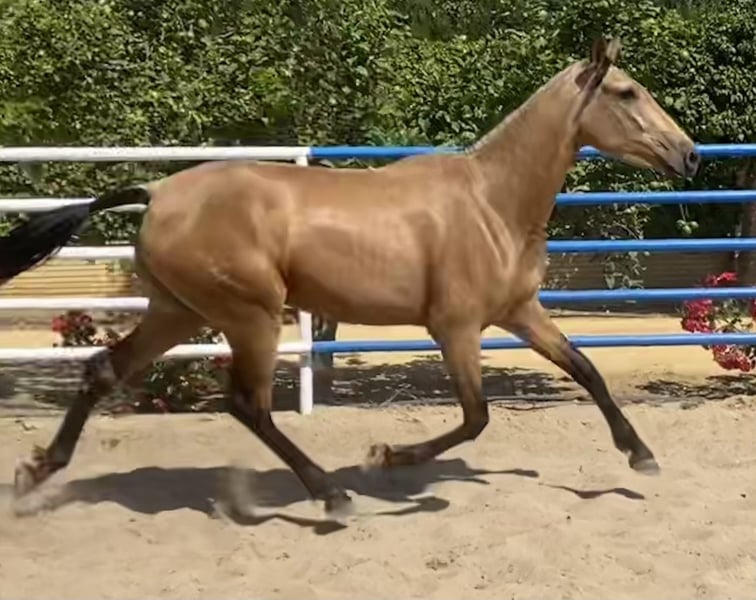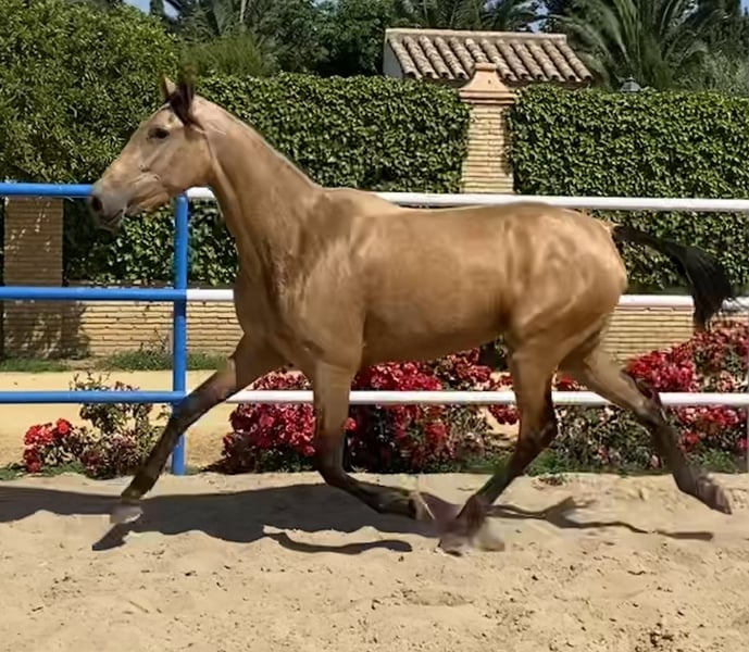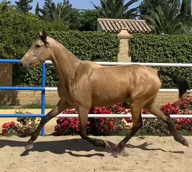 Eccellente cavalla Baya gravida di stallone Palomino nipote di Simpático de Millán III, allevatore miglioratore. Magnifica opportunità di acquistare una cavalla per la riproduzione o lo sport e di godere della sua eccezionale nobiltà, bellezza e superba genetica.