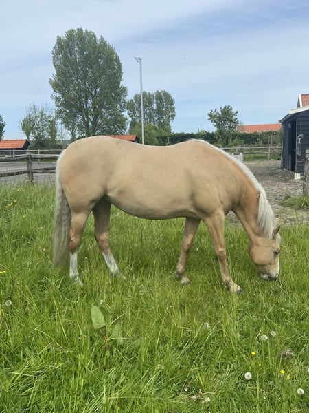 Deze lieve, leergierige, mensgerichte en sociale merrie zoekt de juiste match. Leeftijd: 5 jaar Schofthoogte: 1.58 m ( niet officieel gemeten) Kleur: Palomino Vrij van PSSM1. Inclusief Carta Mar Wonderful x Atenta VLR Al sinds veulen in mijn bezit. Geen trauma’s. Is zadelmak, maar nog niet doorgereden. Bitloos beleerd. Onder het zadel eerder wat terughoudend, dan heel erg loperig. Mogelijk is dit een kwestie van conditie opbouwen, maar ik heb ook de indruk dat ze het werk in de bak niet zo leuk vind. Om die reden denk ik dat een andere ruiter haar gelukkiger zal maken, omdat ik juist graag fanatiek dressuurmatig train en houd van paarden met meer energie/looplust. Kan onder het zadel soms subtiel wat spanning opbouwen. Als je dit niet tijdig herkent en af laat vloeien, kan dit uiten in flinke bokkensprongen als haar emmertje overloopt. Daarna is het wel direct klaar. Ze blijft niet aanhouden of schrikken op dezelfde plek. Hierdoor is ze niet geschikt voor de beginnende ruiter. Ik verwacht dat dit zal verbeteren als ze verder wordt doorgereden, omdat ze verder heel rustig en nuchter is. Ik denk dat ze het beste past bij een zelfverzekerde recreatie ruiter, die naast het rijden in de bak ook andere dingen met haar doet, zoals buitenritten, vrijheidsdressuur, lange lijnen en liberty. Vooral dit laatste zou haar denk ik heel goed passen. Aan de hand is ze erg nuchter. Ze is goed verkeersmak. Gaat regelmatig mee wandelen. Hangt dan niet aan een ander paard. Laat zich snel geruststellen door haar begeleider als ze toch iets spannend vindt. Is respectvol, mensgericht en goed opgevoed. Reageert goed op lichaamstaal en stemhulpen. Ze staat hier in een kleine kudde. 24/7 buiten met schuilstal, met beperkte weidegang (4 à 5u per dag) en altijd toegang tot hooi uit slowfeeders. Ze gaat alleen weg als ze het (nog) beter krijgt dan hier en dus enkel bij een juiste match. Tijdens een Metavitalscan is per toeval gebleken dat ze de ziekte van Lyme heeft. Dit speelde volgens de scan geen actieve rol meer. Via bloedonderzoek is dit bevestigd (heeft antistoffen tegen de bacterie). Ze krijgt hiervoor een kruidensupplement en lijkt er verder geen klachten van te hebben. Daarnaast heeft ze vorig jaar september een allergische reactie gehad op iets. Ze stond onder de bulten (netelroos). Ik heb een allergietest gedaan, maar hier kwam geen duidelijke uitslag uit (is in te zien). Afgelopen september stond ze weer enkele weken onder de bulten, die daarna vanzelf weer verdwenen. Het lijkt dus een seizoensgebonden allergie voor iets hier op het terrein. Laatste foto is vader. Eén na laatste foto met moeder. Indien gewenst is haar splinternieuwe, aangemeten Deuber zadel over te nemen ( El Campo, in de kleur Havana/cognac, S2) + bijpassend hoofdstel (voor een bit) en een cognac bitloos hoofdstel (Edix).
