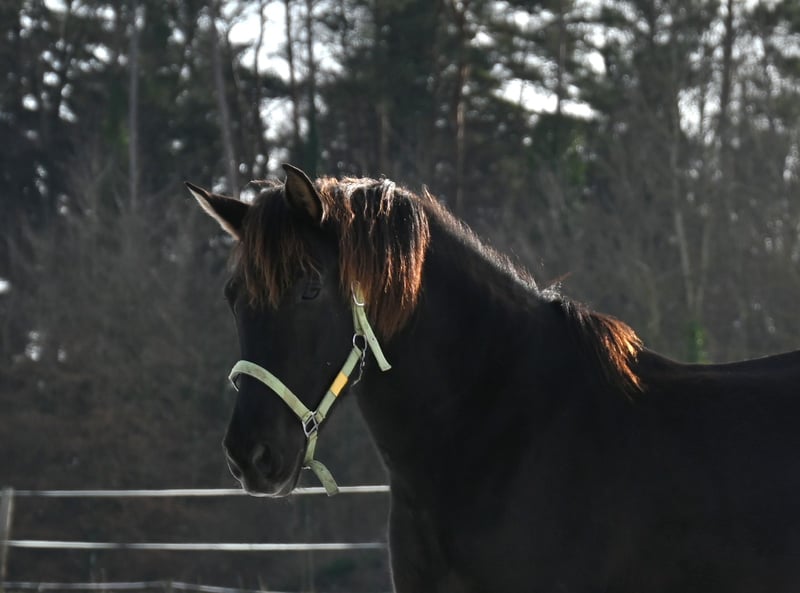 Macarena de Lucia is a 5.5-year-old PRE black mare with pure Escarlata lineage. Her breeding index is 98.31%, and she is a homozygous mare for the black color EEaa. Currently, Macarena stands at 159 cm tall, and it is likely that she may grow another 1 or 2 cm. She is very strong-minded, affectionate, and friendly. Macarena is ridden both in the arena and on trails, where she demonstrates good behavior with a pleasant forward drive. So far, she has had 2 filly foals, one of which she is still nursing until September; the births went well. The Escalera line is one of the oldest bloodlines in Spain and is the result of a consistent breeding program by a family that goes back more than 200 years. A notable characteristic of Escalera horses is their high willingness to perform, baroque, noble horses with physical strength, good rideability, and outstanding movements. The foundation of Escalera horses consisted mainly of brown mares, with few exceptions of blacks, which were then paired with the best and most athletic stallions from the Yeguada Militar. For this reason, Escalera horses are particularly suited for dressage and consistently rank high at various breeding shows. Macarena is vaccinated, regularly dewormed, and in excellent health. She is familiar with farm machinery and other farm animals as well as playing children, and she is good for the farrier and loading. After the birth of her foal, she was checked by an osteopath. Her daughter Hermosa Perla Negra can be weaned starting in September. Sire: Escogido XXIII Dam: Manzanillo XII