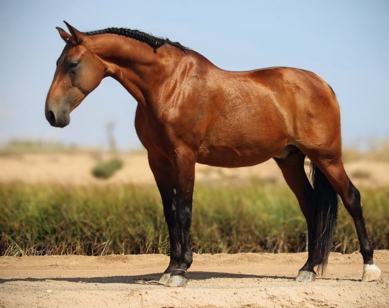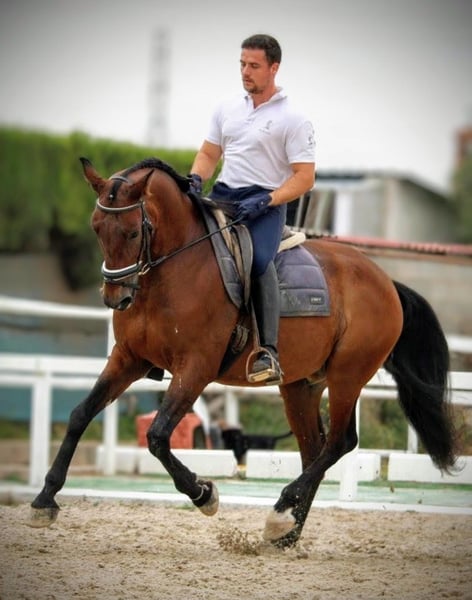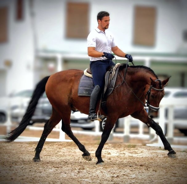 Oriente is a 12-year-old, stunning PRE gelding looking for his forever home... He is a true gentleman in handling and knows how to behave impeccably. He is a very ambitious yet sensitive horse with an outstanding work ethic. His exceptional movement—rare among PREs—makes him stand out beautifully in the dressage arena. He is ridden in a top-quality water bit and already performs exercises such as leg yields, shoulder-in, travers in all gaits, as well as rein-back and canter-trot transitions. Oriente is a real eye-catcher, with a dynamic presence that highlights his excellent movement quality. In the field, he is absolutely reliable and accustomed to riding alone or in a group. Due to his sensitive nature and willingness to work, he is looking for a knowledgeable and experienced rider who can continue to develop him appropriately. This handsome heartbreaker is searching for a person with whom he can share a lifelong partnership.