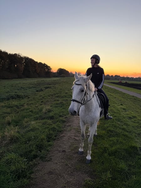 Karakter: Een eerlijk, slim en werkwillig paard. Door zijn formaat, kracht en voorwaartse instelling niet geschikt voor beginners of onzekere ruiters. Hij vraagt een duidelijke, zelfverzekerde ruiter, maar geeft daar enorm veel voor terug. Voor een ervaren ruiter (18+ of met veel ervaring) is hij een echt droompaard: betrouwbaar, leergierig en fijn te rijden. Hij is echt heel erg slim en pakt snel dingen op! Ook kan hij voorzichtig/gevoelig zijn. Heb je interesse of wil je meer informatie? Stuur gerust een bericht! Over hem Bomproof PRE-ruin | 14 jaar | ca. 1.75 m Een indrukwekkende maar zachtaardige reus, mét stamboek en alle officiële papieren. Hij is volledig verkeersmak, zowel in klein als groot verkeer, en afgelopen maand nog gecontroleerd door de osteopaat. Hoeven net gedaan. Verzorging & gezondheid Loopt netjes ijzerloos Hoefverzorging altijd keurig bijgehouden (gevoelig voor rot straal, dit is een puntje) Inentingen volledig op orde Recent mestonderzoek + wormenkuur gehad Wat kan hij? Dressuurmatig gereden op L-niveau Wijken Schouderbinnenwaarts Springt met plezier rond de 80 cm Dol op balkjes Gaat graag op buitenrit, alleen of met gezelschap