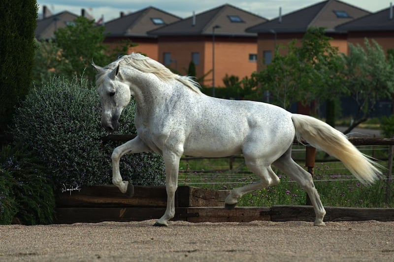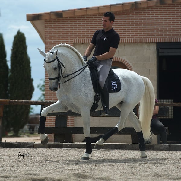 Baronet del Abadia wurde bei uns am 26.02.2023 aus unserer Zuchtstute Gracia IV und Doblón-TR (letzte 4 Fotos) geboren. Baronet ist ein besonders schönes und kräftig gebautes Hengstfohlen. Er hat einen sehr guten Schritt, einen elastischen Trab und eine raumgreifende Bergaufgaloppade. Diese Bewegungen verdankt er sicherlich auch seinem Vater Doblón-TR, Elitehengst und Sohn von Ermitaño III, dem ersten Elitehengst der PRE. Baronet ist ein dynamischer, athletischer Typ. Wir sehen für ihn eine sehr gute Zukunft in der Dressur. Ende August gewann er beim Campeonato Centro Europeo in Brügge eine Goldmedaille in der Serie der 1-jährigen Hengste. Dort erhielt er die beste Bewertung sowohl für die Morphologie als auch für die Bewegungen. Baronet ist ein taubes Pferd, er ist sehr respektvoll und arbeitswillig. Anhänger, Hufschmied, Tierarzt, etc. sind kein Problem. Wer ihm Zeit geben möchte, sich zu entwickeln und mit ihm zusammen zu wachsen, wird viel von Baronet zurückbekommen. Mehr Infos über elabadia@telenet.be oder +32(0)489361015. Wir befinden uns in Belgien, Region Veurne. Sie sind jederzeit herzlich eingeladen, unseren Zuchtbetrieb zu besuchen!