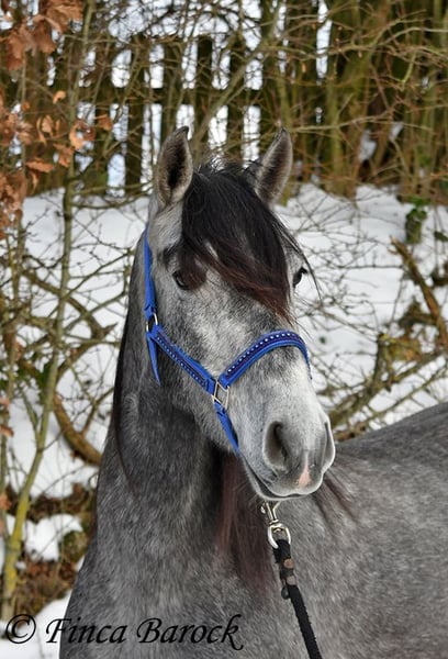 Ras: PRE Naam: Artico XIV Geslacht: Ruin Stockmaat: 1,56 m Geboortedatum: 05-04-2022 Kleur: Grijs (schimmel) Prijs: € 6.300 Vader: Calesero XLIX v. Bosqueado Moeder: Fogosa XLIV v. Bonito VI Artico, onze jongste knul met prachtige grote zwarte ogen en een dubbele manen. Hij staat nog volop in de groei en zal nog verder uitgroeien. Hij is nog heel aan het begin van zijn opleiding en toont zich aanvankelijk wat verlegen. Hoe meer hij zijn mens leert kennen, hoe opener hij wordt. Dan vindt hij knuffelen ook heerlijk en is hij erg speels. Artico kent al het longeren met de halster en zadel en bit, en wordt langzaam vertrouwd gemaakt met opstaphulpmiddelen. Over het algemeen is hij zeer leergierig en doet goed mee. Door zijn ietwat verlegen aard heeft hij tijd nodig om te wennen. We zoeken daarom iemand voor hem die hem de tijd geeft om te acclimatiseren en hem voorzichtig aan het rijden te laten wennen. Hij mag ook graag bij ons blijven voor verdere opleiding. Artico is gewend aan groepshuisvesting en toont zich hier speels en open. Inmiddels is hij volledig onbezwaard. Een prachtige PRE aan het begin van zijn opleiding, met goede basisgang en een sterk gebouwd lichaam, dat klaar is voor nieuwe uitdagingen! Vrijloopvideo: https://youtu.be/hRm4Z5HkuB8?si=iKE-NTcvQHAMn7Uw Contact: Finca Barock, Tel. 0173-696 31 81, 56291 Wiebelsheim