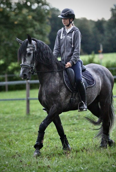 Zum Verkauf steht ein ausgesprochen lieber und zuverlässiger PRE Wallach, 4.5 Jahre alt, mit bester Abstammung aus Yeguada Militar und Cartujano-Linie. Dieser junge Wallach besticht durch sein ausgeglichenes Wesen, seine Gelassenheit und seine beeindruckend schönen, raumgreifenden Gänge. Er ist super brav im Umgang und einfach zu reiten, auch für weniger geübte oder unsichere Reiter bestens geeignet. Orgulloso hat Spass am Springen und echtes Talent. Geländesicher, aufmerksam und sicher. Auch unter dem Sattel zeigt er sich lernwillig, fein zu reiten und sehr angenehm in der Hand. Ein Traumpferd in jeder Hinsicht.
