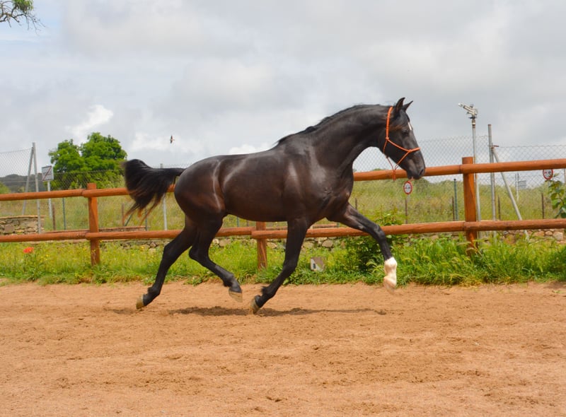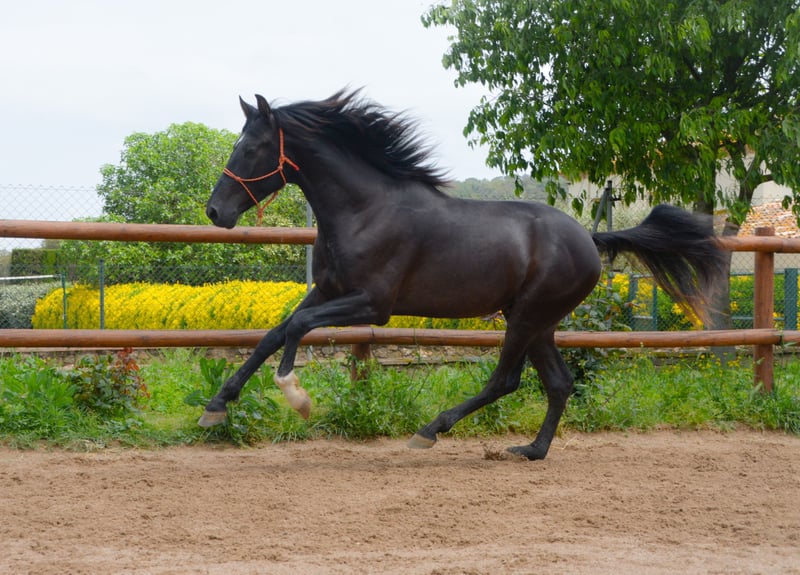CORREFOC puledro PRE nero di 3 anni, 165 cm di altezza, appena rientrato dal campo, con ottimi movimenti e morfologia, sta iniziando il suo addestramento e a essere montato.