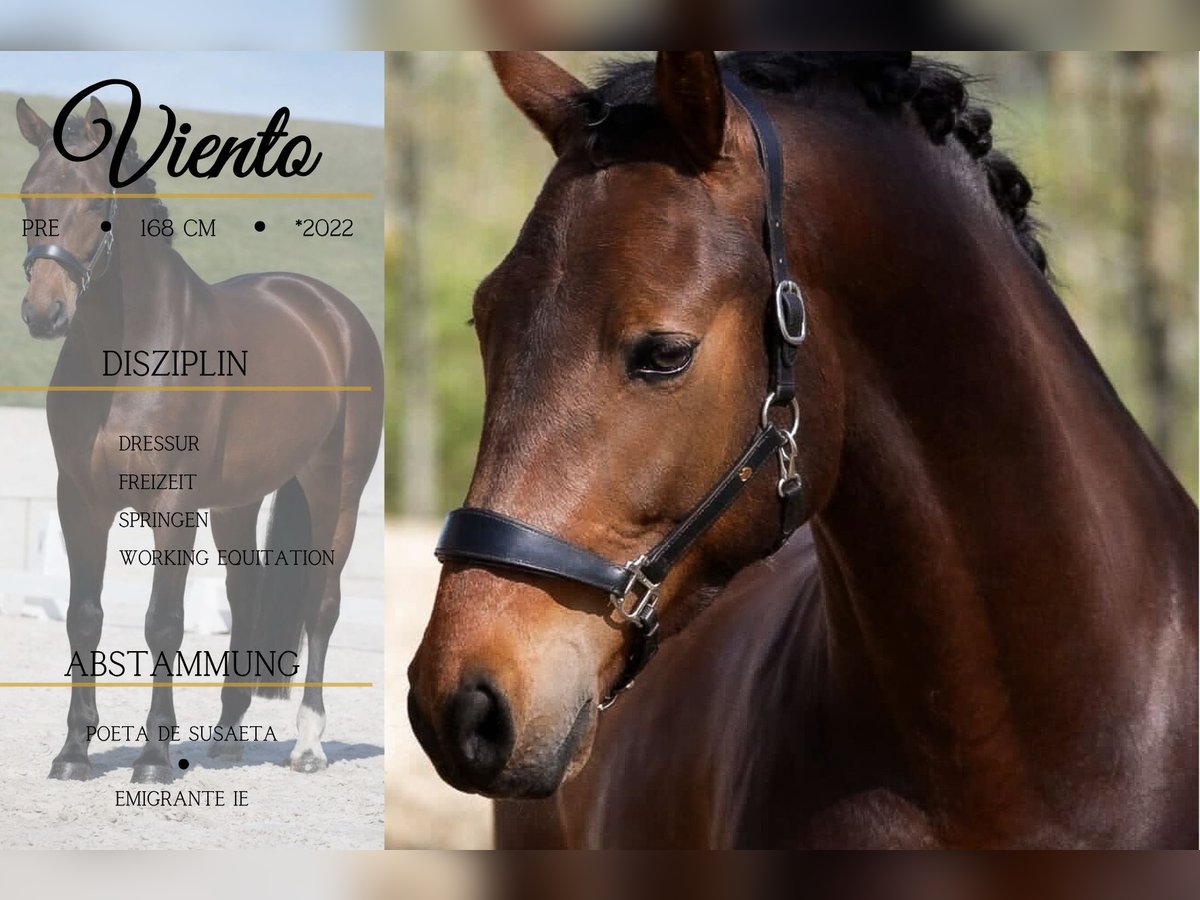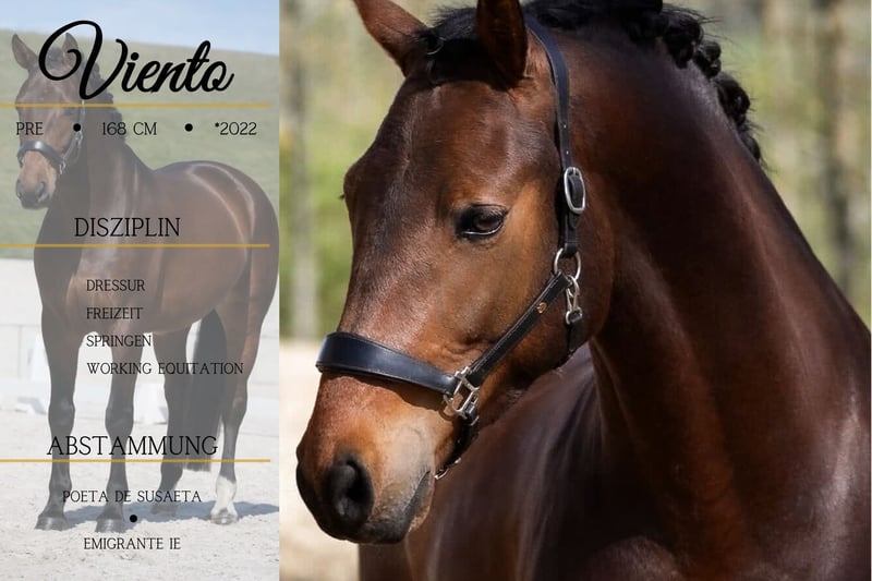 Viento is een 4-jarige PRE-merriehengst van ongeveer 1,68 m, afstammend van: Poeta de Susaeta, Cacique x Emigrante iE (succesvol op Z2-niveau dressuur). *Viento* heeft een prachtig warmbloedtype en beschikt over drie goede gangwerken. Het is een veelzijdig paard dat geschikt is voor sport en recreatie. Hij beweegt op leeftijdsadequate wijze zeer mooi in de ring, is absoluut relaxed en onbevreesd. Hij biedt zich goed aan voor rijden en geeft altijd een veilig gevoel. In het terrein gaat hij zowel solo als in een groep, ook in onbekende omgevingen. We hebben hem al zonder zadel gereden; hij staat open voor alle plezier. Naast zijn geweldige karakter beschikt hij ook over voldoende potentieel. Een droompaard in alle opzichten. In de omgang is hij mensgericht en knuffelig, hij verovert snel harten.