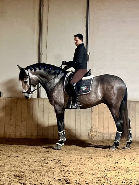**Caballo castrado de 2022, Tordo, 175 cm, Doma clásica** Presentamos un hermoso caballo castrado, nacido en 2022, de color tordo y con una alzada de 175 cm. Este ejemplar cuenta con una excelente predisposición para la doma clásica, mostrando un carácter tranquilo, inteligente y bien manejado. Su entrenamiento en doma clásica está en marcha, y demuestra una buena actitud en el trabajo, con movimientos elegantes y una postura correcta. Ideal para jinetes que buscan un caballo con potencial para seguir desarrollándose en la disciplina de doma clásica, o para aquellos que desean un compañero confiable y bien formado. Un ejemplar con mucho futuro y buena presencia, listo para continuar su doma. Ya ha salido a competir en caballos jovenes sacando mas de 70%. Disponible a cualquier prueba