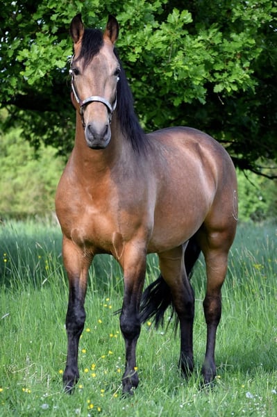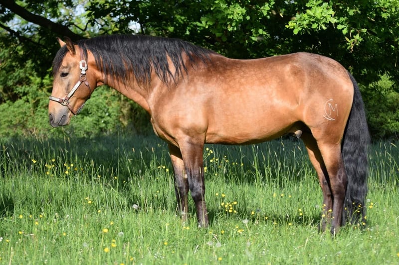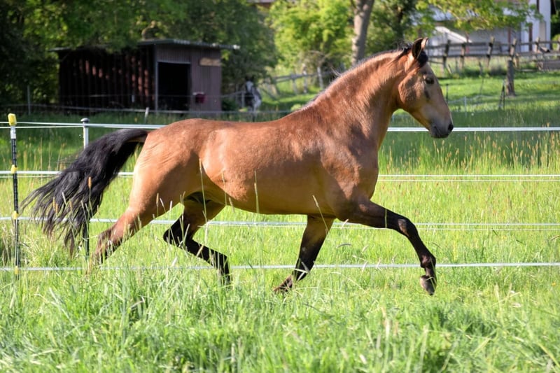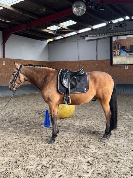 Stunning PRE gelding, born February 2021, in the rare color Buckskin/Falbe. He is very baroque in build, extremely compact, and has a correct conformation. In summer, his coat shines with a beautiful golden hue – truly eye-catching. With an approximate height of 16.1 hh, he provides excellent coverage for his rider and impresses with his striking appearance. The gelding is regularly dewormed and vaccinated and is accustomed to box and paddock turnout. Character-wise, he is an absolute treasure: friendly, affectionate, playful, well-mannered, brave, curious, open-minded, and very attached. Under saddle, he is incredibly comfortable to sit, demonstrates good basic gaits, and always works with motivation and eagerness to learn. He has a solid foundation of training: he walks all basic gaits, performs lateral movements, and can be ridden backward. On the ground, he also shows great talent – piaffe and Spanish walk are achievable. Groundwork is very familiar to him. A truly beautiful, talented horse for a motivated rider who enjoys working together and nurturing his potential.