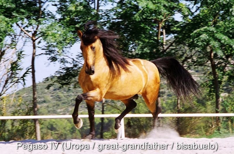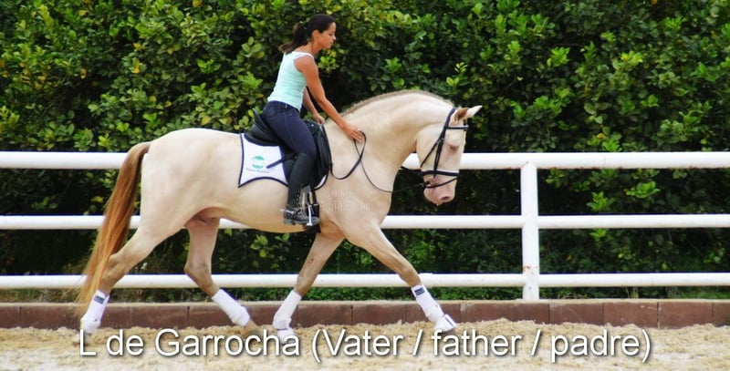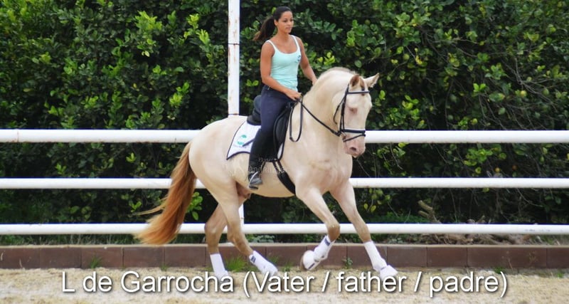 carácter tranquilo con temperamento agradable, curioso, mimoso, domado, grande, buenos movimientos, negro con gen PRL, pedigree: Paco Marti, Hnas San Roman www.elegante-andalusier.com
