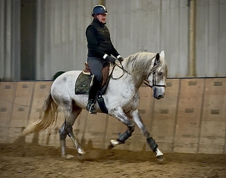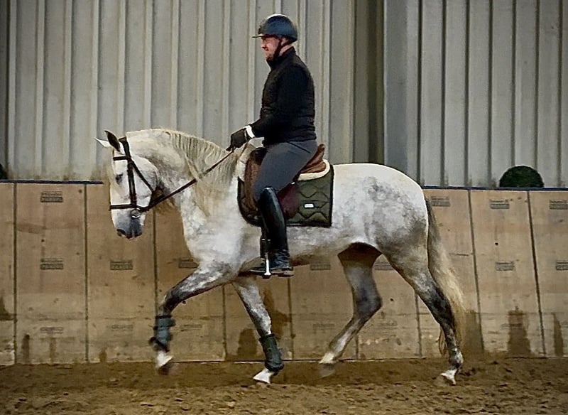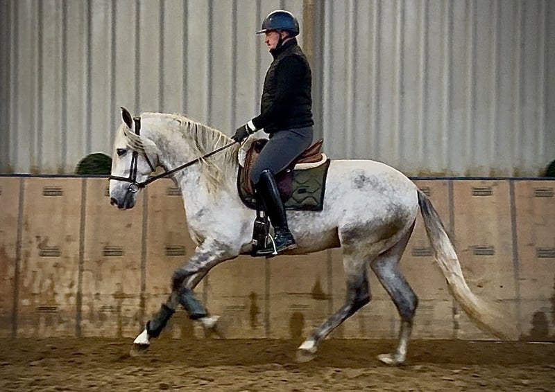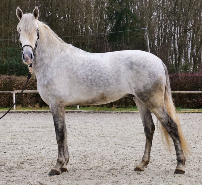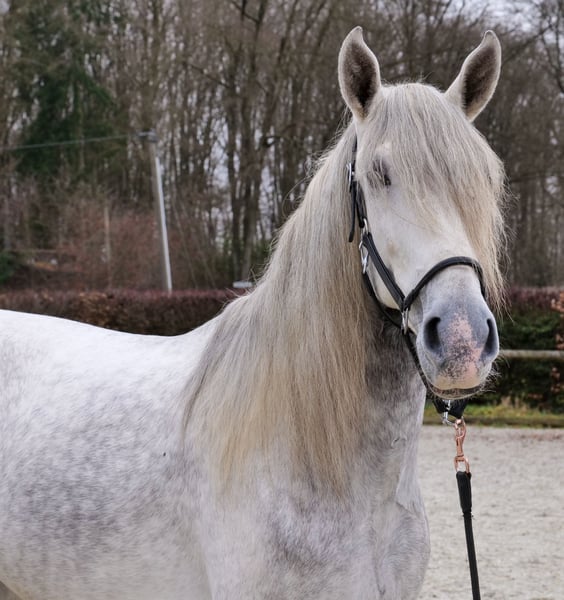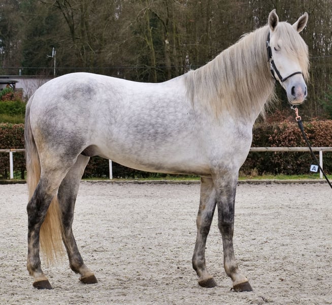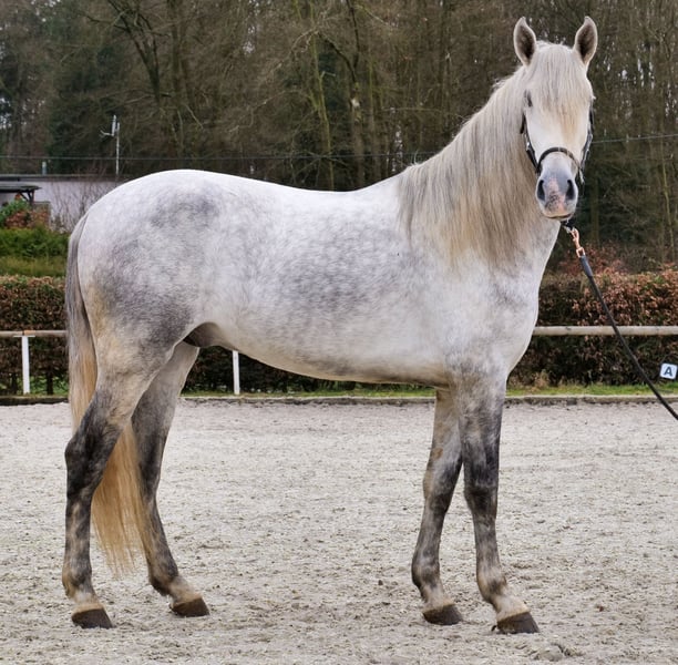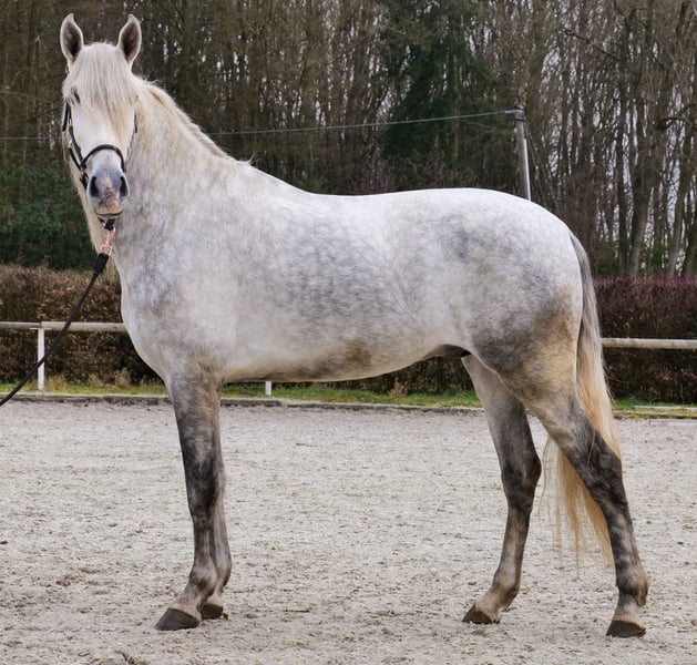 Name: Virtuoso De Cuenca Breed: P.R.E. (Pure Spanish Horse) Gender: Gelding Date of Birth: April 12, 2021 Age: 4 years Height: 16.1 hh Color: Grey (Dapple Grey) Pedigree: Known Temperament: Willing to learn, reliable, curious, intelligent, people-oriented Training/Suitability: Riding, Dressage, Leisure riding, Single harness driving, Working Equitation Trail Experience: Trustworthy, fearless, resilient, calm under pressure, experienced both alone and in a group Health: Dewormed, vaccinated, barefoot, eczema-free, teeth checked, osteopathically treated Stabling: Box stall, open stable Special Features: Very comfortable rider, shoeing and loading confident, herd-compatible Please note that these characteristics are based on our personal assessment and do not constitute guaranteed traits. Price: €8,900 (gross price) Interested? To give you a better impression of Virtuoso, we are happy to send you a riding video. Of course, we are available for a detailed description of the horse, personal consultation, and to answer all your questions via phone. Feel free to contact us anytime via WhatsApp or call us at: +49 151 19487595 Our phone hours are daily from 7:00 to 13:30 and again from 20:00 onwards. We look forward to hearing from you! A clinical or radiological pre-purchase examination can be performed by your veterinarian of choice. Virtuoso can be safely and comfortably delivered to his new home. We handle all preparations and transportation to ensure your new horse arrives stress-free, well cared for, insured, and in good health. Currently, we offer a carefully selected range of horses for sale. With us, you are sure to find your dream horse. Visit us also on our website: www.marvinsroyalhorses.de. Dear clients, we are happy to introduce you to our horses and offer grooming, tacking, lunging, ground work, and trial riding in the riding hall, on the arena, or in the field to get to know your new family member better. The fee is €40 per horse, with each additional horse €30, and will be refunded upon purchase. Our address: Ferdinand Grube 50 53577 Neustadt-Wied Google Maps: marvinsroyalhorses
