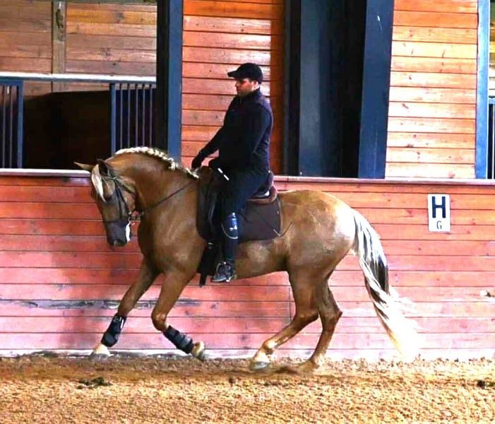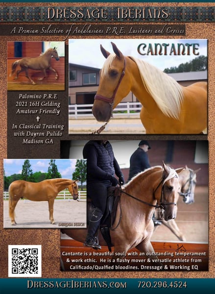 Meet Cantante, a breathtaking 4 year-old golden palomino P.R.E. gelding, radiating elegance, kindness, and charisma. This young star captivates everyone with his agile movements and expressive gaits, lighting up the arena & always turning heads. His lineage includes numerous Spanish champions and qualified stallions in Spain, including REMACHE XIII, YACO II, GAVILAN and more. It is very rare to find his bloodlines and quality in the palomino color. He is a treasure! Registered with ANCCE studbook (Spain). In professional training, and recently started under saddle, Cantante showcases an exceptional work ethic, making him a perfect partner for an ambitious amateur in a training program. His versatility shines, poised to excel in dressage, working equitation, or as a dazzling exhibition or liberty horse. He is still growing and measures apprx 15.3H and expected to grow more. Don’t miss the chance to sculpt this extraordinary talented rare palomino, ready to blossom into a true champion. Contact us today to meet Cantante. He may be purchased and remain in training while being prepared for an amateur partner to embark on his new adventures. Located near Athens & Atlanta, GA VIDEO LINKs on our website and on youtube