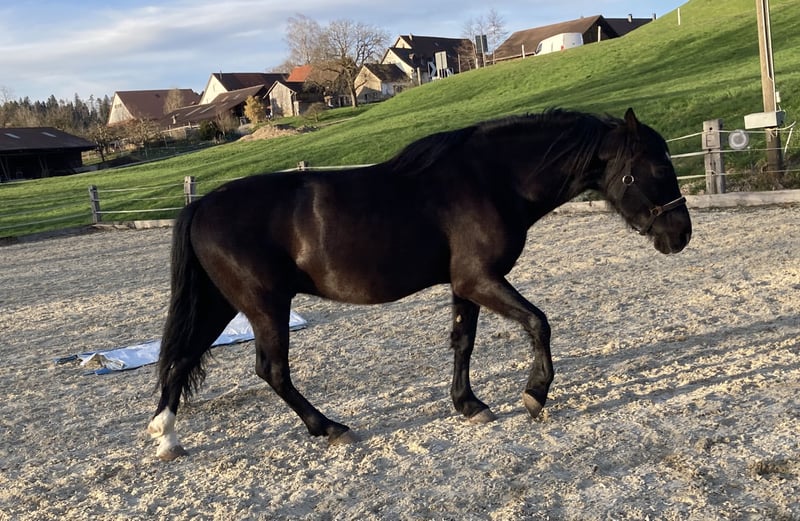 Il aime être au centre de l’attention et cherche donc une personne avec qui il ne doit pas partager son espace avec un autre animal. Il est prêt pour une formation d’adulte (presque) et travaille très motivé en manège. Il apprend avec curiosité et adore passer du temps en tête-à-tête, même lorsque les exercices deviennent un peu difficiles. Je suis moins motivé en carrière et je ne peux pas vraiment stimuler ses intérêts. En extérieur, il se laisse rapidement dépasser (chez mes élèves, je suspecterais un léger TDAH), mais il va fondamentalement partout avec vous. Après une demi-heure, cela lui suffit… nous autres, nous sommes alors encore en train de nous échauffer ;). Il se comporte plutôt comme un chef de meute dans le groupe, tant qu’on ne lui fait pas la leçon. Parfois, il confond cela avec du « leadership », mais ce n’est pas du tout son rôle. Les autres chevaux le laissent simplement faire ce qu’il fait, et tout le monde s’entend bien avec lui. Les personnes qui l’entourent doivent communiquer très clairement avec lui et instaurer des structures strictes. Il adore recevoir des caresses et est très câlin. Il aimerait probablement venir à la maison et dormir dans la même pièce que son humain. À l’adolescence, il joue avec tout ce qui lui tombe sous la patte et aime faire des bêtises – je ris très souvent. Il est né en septembre 2019 en Espagne, a grandi avec ses congénères dans une grande pâture, puis est arrivé en Suisse à l’âge de trois ans pour une formation de base. Lors du processus de vente, une modification du cartilage du canon a été détectée. Je l’ai depuis deux ans et demi, et je n’ai jamais rien remarqué lors de notre quotidien. Actuellement, je le remonte à nouveau, mais je préfère encore confier cela à son nouveau propriétaire.