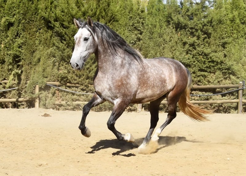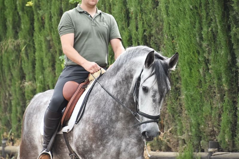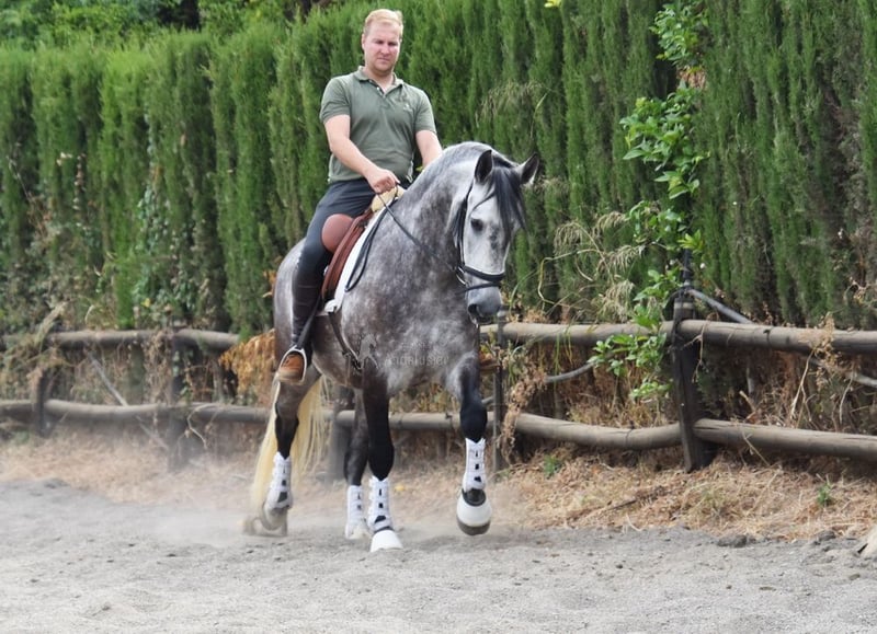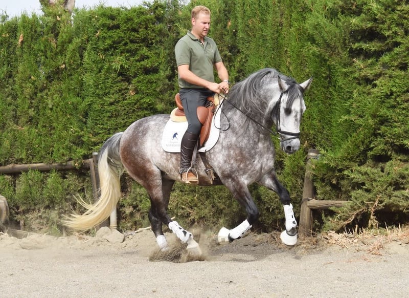 caractère agréable, monté aux trois allures de base, galop extérieur, mouvements latéraux, reculer, passage, quelques changements de pied au galop, reculer, terrain, Feria, Romeria, a déjà participé à des concours de dressage, baroque, a déjà passé des radiographies et est négatif pour la piroplasmose, origine : Candau, Romero Benitez, grands-pères Bronco XVI et Africano XXVIII sont qualifiés www.elegante-andalusier.com