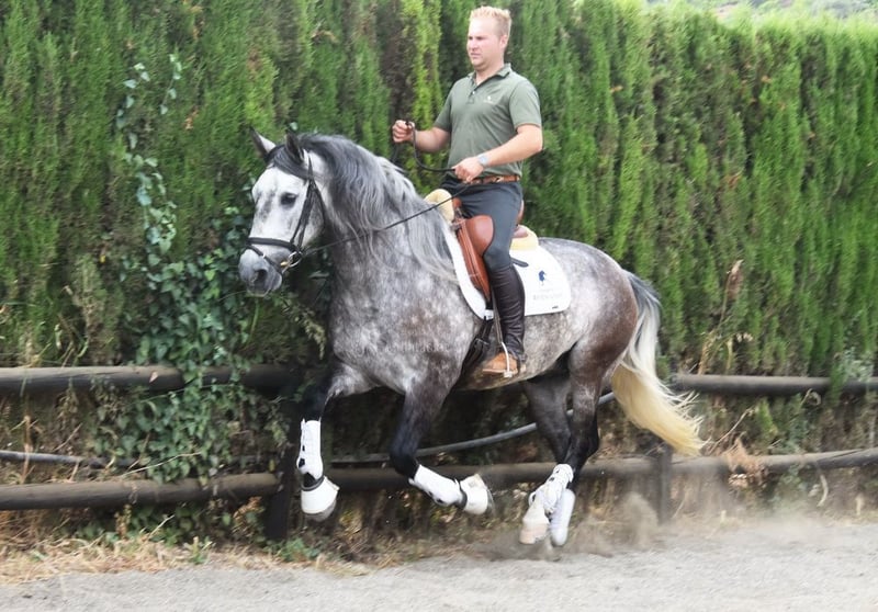 dear character, ridden in the basic gaits, outside canter, lateral movements, backing up, passage, some flying changes, backing up, terrain, Feria, Romeria, has already participated in dressage competitions, baroque, has already undergone X-rays and is Piro negative, lineage: Candau, Romero Benitez, grandfathers Bronco XVI and Africano XXVIII are qualified www.elegante-andalusier.com