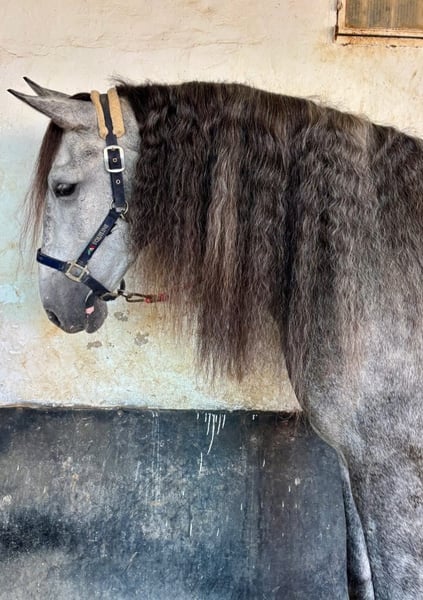 A fantastic, large-framed PRE gelding who is just beginning to fill out his body. He is built on a solid foundation and complemented by a harmonious physique. This gelding is equipped with three very good basic gaits and is ridden in the basic gaits. He can perform shoulder-in, leg-yield, flying changes, and work on piaffe. He consistently shows a very calm and willing attitude during work. He has also been out in the field. The gelding is easy to ride and handle. His breeder has bred him with the Mejoreante stallion Ules, who is a son of the elite stallion Impaciente (Camacho Benitez). On his dam’s side, he has a Yeguada Militar mare, daughter of Pampero V (Marín García). The horse is being sold on behalf of the owner. He can stay in training with us if desired. A veterinary health check (Ausscheidungskontrolle) will be organized shortly. International transport can be arranged.