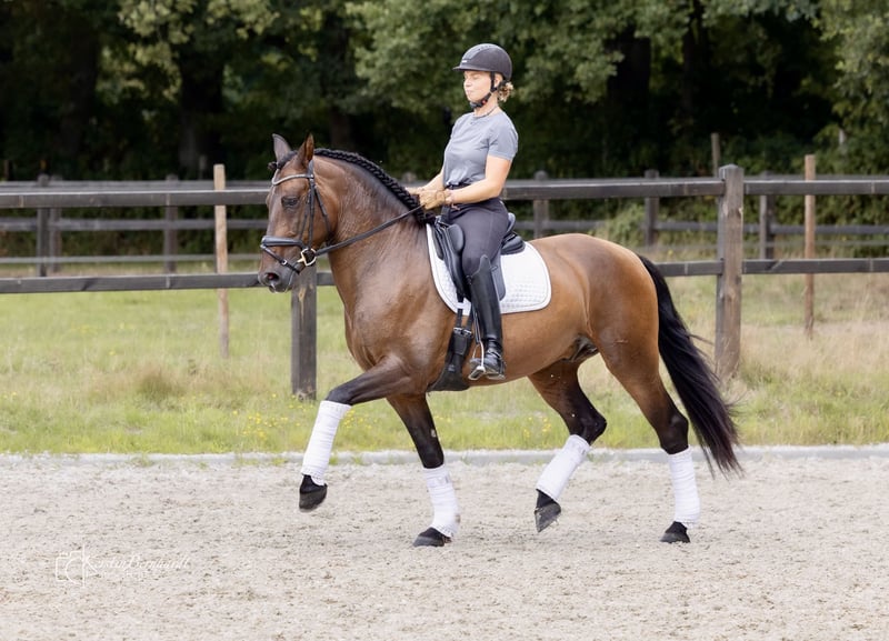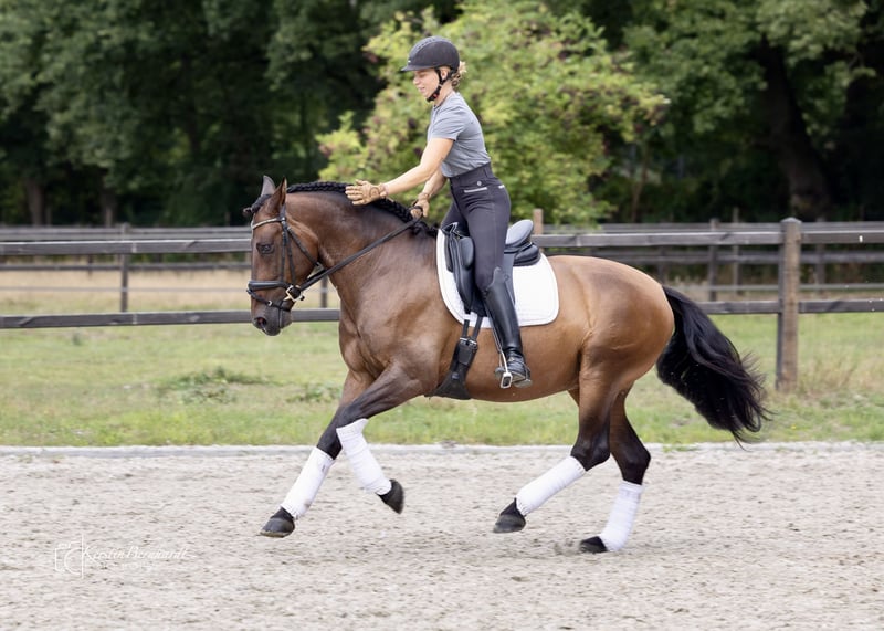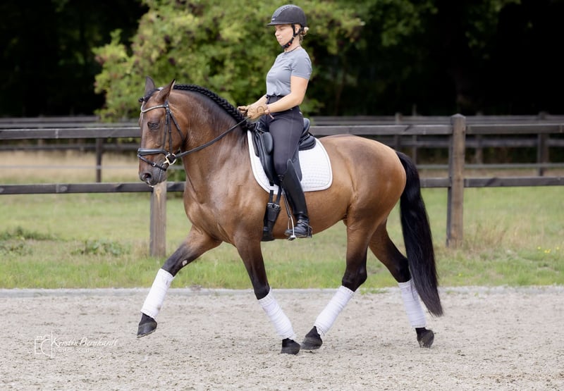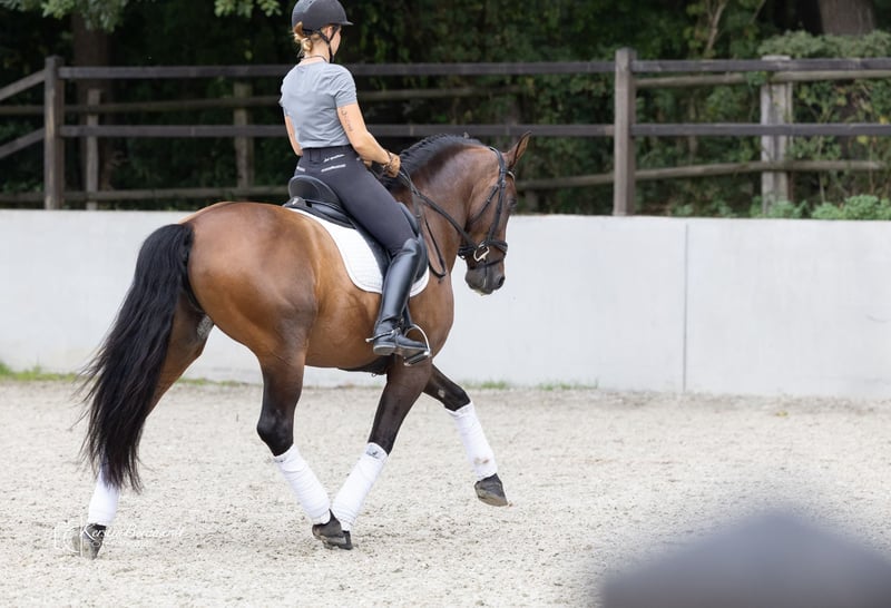 Start the Year of the Fire Horse with a stunning, talented PRE 🔥 Favorito SB V Breed: Pura Raza Española (PRE) Gender: Gelding Born: March 25, 2019 Height: 164 cm – his harmonious, well-built physique makes him suitable for taller riders as well Color: Castaño (Brown) Sire: Galante LX Dam: Favorita CCXX Breeder: Sebastián Brenes Cuenca Location: Dorsten, North Rhine-Westphalia Pedigree & Breeding Lines – Quality with Character Favorito combines classic Cartujano conformation with modern rideability. 🔹 Sire Line – Galante LX (→ Faraón El Bayo × Galatea XXIX) This line traces back through Lunes de Lirio – Aureolo XIV – Cortijero XVI and is known for: - Powerful, correct build - Takt purity and balance - Noble, refined presence Grandfather Faraón El Bayo was a Reproductor Calificado and passed on the typical PRE type with a clear expression. 🔹 Dam Line – Favorita CCXX (→ Sereno VI × Favorita CLXXV) Multiple references to Samaritano VI (Yeguada Escalera) – appreciated for: - Calm, steady temperament - Eagerness to learn and relaxed attitude - Reliability and people-oriented nature Character & Appearance Favorito SB V embodies the elegance of the Andalusian horse – combined with an unusually calm, focused soul: - Proud posture, expressive gaze - Attentive, sensitive, and loyal in interaction - Sensitive to energy and mood, yet clear and controlled - People-oriented, cooperative, and trustworthy A horse that thinks along, rather than just reacts. 🏇 Under the Saddle Under the rider, Favorito impresses with: - Natural balance and carrying ability - Good canter - Willingness to collect - Honest cooperation and high learning capacity Suitable for classical dressage, working equitation, as well as ambitious leisure riding with demands.