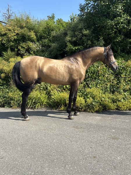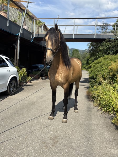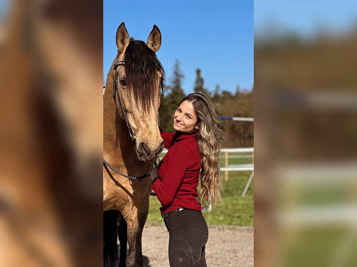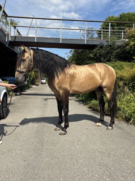 A true dream horse seeking its perfect rider: Spirit is a 7-year-old PRE gelding with a height of 16.1 hh and a special buckskin coat. He combines beauty, expression, and character in perfect harmony. Spirit is licensed and impresses not only with his appearance but also with his noble temperament: - Licensed and from excellent lineage by Paco Martí - Gentle and reliable in the arena, whether alone or in a group. Calm and steady-minded. - Always motivated, eager to learn, and very people-oriented - Sensitive, refined to ride, and quick to learn – ideal for classical riding and fine dressage work Spirit has everything one could wish for in a modern PRE: charisma, rideability, reliability, and a heart of gold. Clear X-ray results available. Many videos of him can be found on our Instagram channel preschweiz.