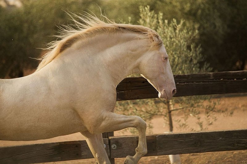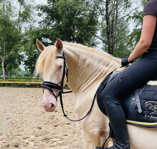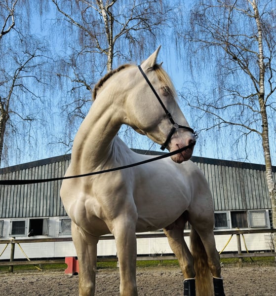 This excellent Cremelo Pearl stallion, purebred PRE, is a real eye-catcher with double cream gene, a rarity for breeding!! To lighten dark colors. He is very well rideable and fantastic to handle. For questions, please call ☎️ 01722420434.