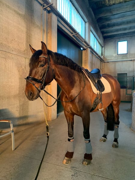 Wallach PRE von 2018 Gut ausgebildet, Level M Super guter Charakter, extrem brav und ruhig, ohne irgendwelche Laster sowohl am Boden als auch unter dem Sattel, arbeitet sehr gut sowohl mit Zügel als auch mit Gebiss, regelmäßige Bewegungen, bombensicheres Pferd, auch von einem Para-Dressurreiter geritten.