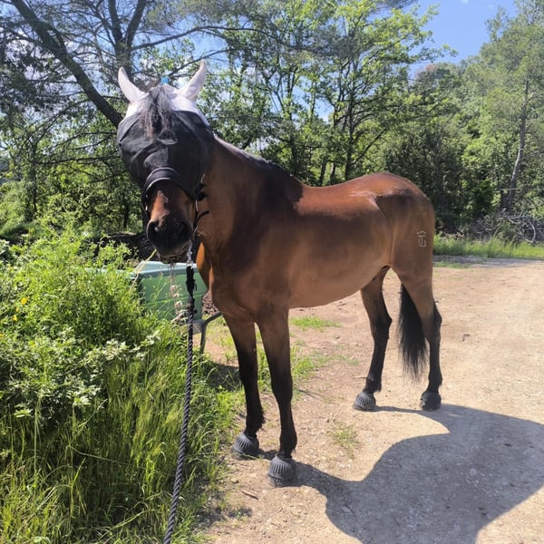 Ce cheval possède un gabarit harmonieux et une locomotion fluide. Il est actuellement travaillé et convient à un cavalier de niveau Galop 5. C'est un compagnon idéal pour un cavalier souhaitant évoluer en compétition ou se faire plaisir au quotidien. Note : Le cheval est marqué à la cuisse gauche (marque visible sur les photos), ce qui peut aider à identifier son élevage ou ses origines.