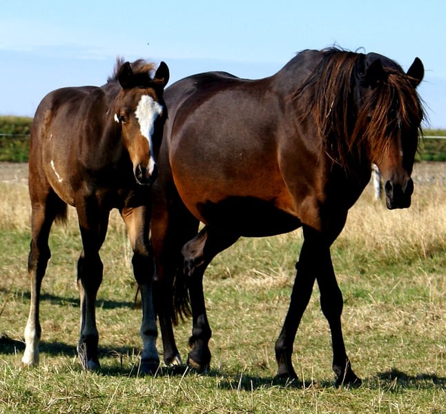 Charming Quarter Pony colt, dark bay with spots. Sire: Paint Horse Kingsley n Jills Wood; dam: German Riding Pony by Kennedy WE. He comes with full papers and a passport from the ZSSE. An outgoing little heartbreaker with a distinctive blaze, a stylish head, and a heart-shaped marking on his neck. Light-footed with large, graceful movements, elegant and agile. Suitable for dressage, and he is out of his German Riding Pony dam.