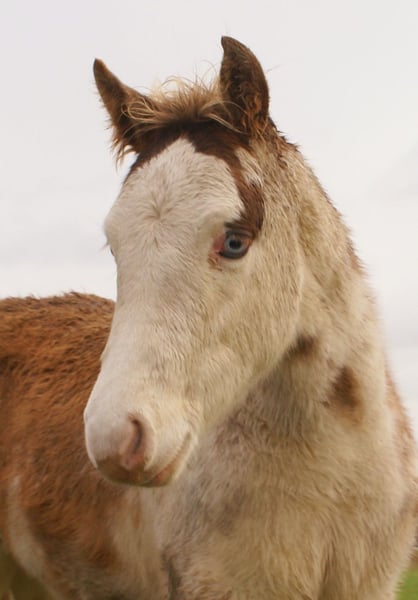In auffälliger chestnut overo Optik präsentiert sich dieses Hengstfohlen mit 2 blauen Augen, Vater: Paint, Mutter: Deutsches Reitpony, das Fohlen hat volle Papiere, wüchsig, fröhlich, besonders
