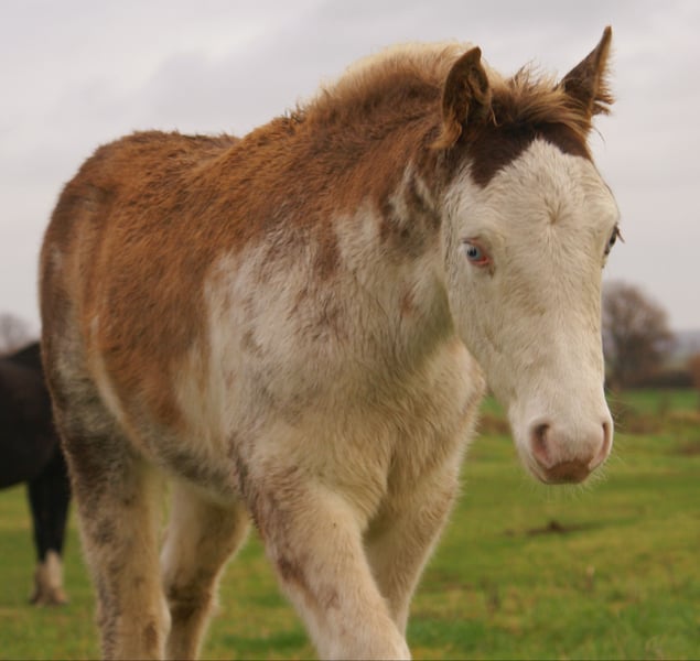 In opvallende chestnut overo-uitstraling presenteert dit hengstveulen zich met twee blauwe ogen. Vader: Paint, moeder: Duits Reitpony. Het veulen beschikt over volledige papieren, is groeizaam, vrolijk en bijzonder.