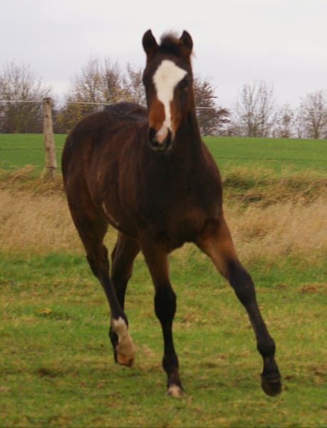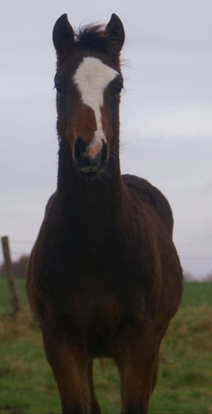 Charming Quarter Pony colt, dark bay with spots, sire: Paint Horse Kingsley n Jills Wood, dam: German Riding Pony by Kennedy WE. The foal comes with full papers and a passport from ZSSE. Raised alongside other foals, this friendly little heartbreaker features a distinctive blaze and a heart-shaped mark on its neck. Light-footed with expressive, large movements.