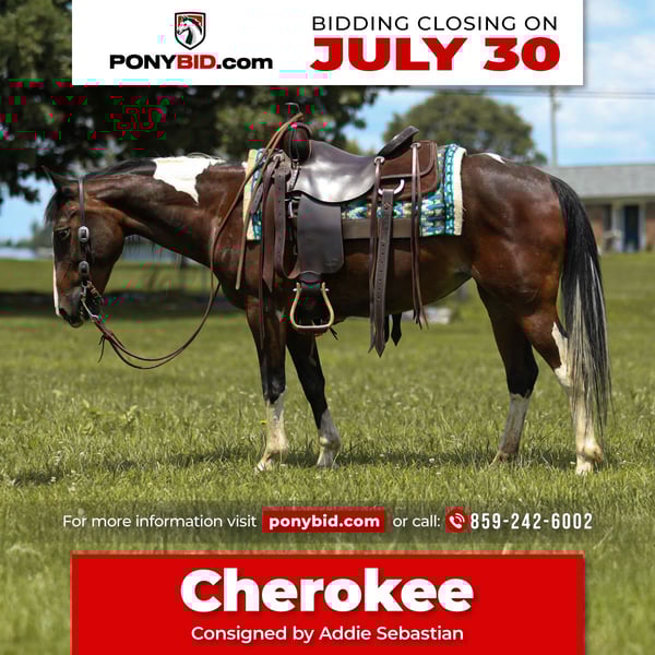 ♦️ THE LITTLE HORSEMAN'S SELECT ♦️ Happening now thru WEDNESDAY | JULY 30TH - Available EXCLUSIVELY on PonyBid's website! For more details and to register visit: www.Ponybid.com CONSIGNOR CONTACT: Addie Sebastian 859-242-6002 LOCATION: Falmouth, KY BREED: Quarter pony REGISTERED: No COLOR: Paint HEIGHT: 13.2 AGE: 12 GENDER: Mare - 12yo, 13.2 hand tall paint mare. Cherokee is the kind everyone is looking for ! She is been there, done that. Cherokee trail rides by herself or in a group, she crosses anything she comes to, she has done the play day shows, she’s currently being used in a beginner riding lesson program, she’s done the obstacle courses, been ridden in parades, and she’s even broke to pull a carriage. Rather your looking for something you can ride or your kiddo can ride, Cherokee can do it all. She’s the kind I like to call “Jack of all trades” Cherokee is easy to load, hauls quietly, easy to bathe, stands ground tied to tack, good for the vet and farrier, stands tied, stands to be mounted, meets you at the gate, etc. Cherokee has a very cute trot and lope. She neck reins, moves off leg pressure, & side passes to open and close gates. I’ve ridden Cherokee bridless and bareback. Previously Cherokee was used on a kids camp and was also used for birthday parties. Cherokee mildly foundered about a year ago. She does wear pads on the front right now.