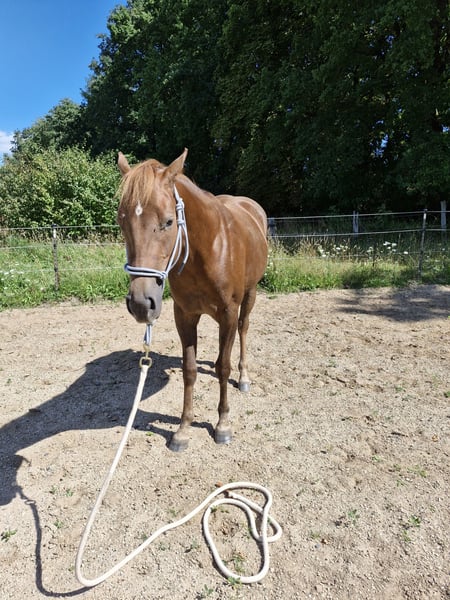 - Umständehalber (zeitlicher Druck meinerseits) im Preis gesenkt. Trotz Zeitdruck gilt: Abgabe nur an einen geeigneten Platz - Diese tolle Quarter Pony Stute aus 2023, eingetragen beim ZSSE sucht ein neues, förderndes zu Hause. Stockmaß ~150cm. Die beiden letzten Bilder zeigen sie im Sommer 2025. Ihr Vater ist Playing with badger, der 2025 auf der German Open unter den top 25 im Ranch riding landete. Ihre Mutter ist erfolgreich in der Distanz bis 60km, stets mit bestem Vet-Check. Diese junge Stute bringt alles mit, was man sich von einem Ranch-Horse oder Reiningpartner wünscht. Sie verfügt über eine hervorragende Auffassungsgabe, ist nervenstark und zeigt will to please. Sie ist vom Boden gearbeitet, jedoch aufgrund der Schonung der jungen Gelenke wachstumsbedingt wenig longiert. Bei der Freiarbeit zeigt sich ihr Talent: sehr Wendig, schnelle Reaktion, gute Kooperation. Das Satteln kennt sie bereits und zeigte hier keine Auffälligkeiten. Typisch Ranchhorse mag sie Routinen und hat gerne klare Aufgaben. Neuen Dingen begegnet sie wach, aber kontrolliert. Sie ist selbstverständlich regelmäßig dem Schmied vorgestellt und läuft barhuf, wobei zu betonen ist, dass sie über eine hervorragende Hufqualität verfügt. Außerdem ist sie geimpft, entwurmt und die Zähne wurden halbjährlich kontrolliert. Generell ist sie im Umgang mit Kindern brav, aber aufgrund des Alters nicht als Kinderpony geeignet Ich wünsche mir für sie jemanden der ihr Talent erkennt und fördert. Sie kennt Box und Offenstall, zeigt sich in der Herde ranghoch. Eine größere, solide Herde ist daher empfehlenswert. Menschen begegnet sie freundlich und kooperativ. Eine AKU kann auf Wunsch veranlasst werden. Der Preis ist verhandelbar, ich wünsche mir ein passendes zu Hause für sie. Es handelt sich um einen Privatverkauf. Weitere Infos gerne auch telefonisch, nach kurzem Schriftverkehr.