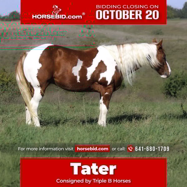 ♦️ 𝐭𝐡𝐞 𝐀𝐌𝐄𝐑𝐈𝐂𝐀𝐍 𝓕𝓪𝓵𝓵 𝓒𝓵𝓪𝓼𝓼𝓲𝓬 ♦️ Happening now thru MONDAY | OCTOBER 20th - Available EXCLUSIVELY on HorseBid's website! For more details and to register visit: www.Horsebid.com CONSIGNOR CONTACT: Triple B Horses 641-680-1707 LOCATION: Plano, IA BREED: Quarter Pony REGISTERED: No COLOR: Sorrel and White paint HEIGHT: 14.2 AGE: 10 GENDER: Gelding Short, chunky, and ready for any trail! Tater is a 10 year old quarter pony gelding standing just a tick below 14.2 hands. This boy has the sweetest personality ever! You could spend all day just brushing him and he wouldn’t move a muscle! Tater is a trail pony delux! He has seen more miles than your Polaris ranger and more miles on the road than your 1979 Chevy! From the black hills to the Smokey mountains Tater has been on NUMEROUS overnight camping trips. He is as sure footed and reliable as they come! He will cross mud, water, logs, ditches with ease. Load the saddle bags with as much as you can fit and go get lost in the woods he will go all day long and take care of you every step of the way. He has been rode to the local bars, been in parades, done some walk trot classes at the fun shows, and even some lessons! He is SAFE, SAFE, SAFE. Tater dosent have an extremely fancy handle but he is sure enough a point go stop and turn kind of guy making him the perfect for a beginner to learn on! He will lopes circles both ways and knows his correct leads. For little kids to learn on or an adult that just wants something short and chunky to get you back to the trailer after to many beverages this guy fits the bill! He is not barn or buddy sour. Very easy to catch, stands to be groomed, tacks up easy, loads good. Gets along with a mixed herd. No maintenance. Easy keeper. He is current on dental, wormer, and coggins! Tater is 100% sound and has a PPE on file performed 10/8/25