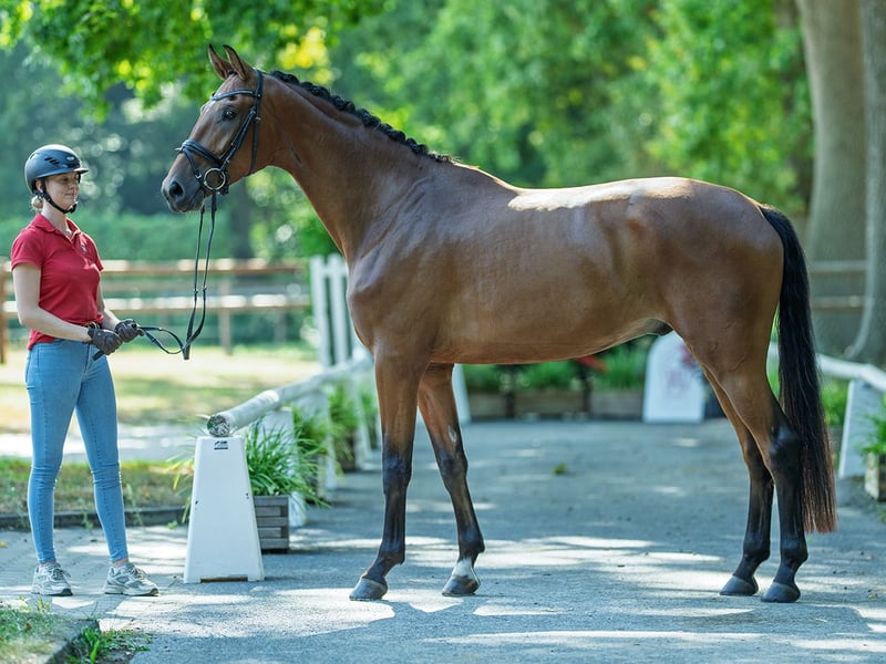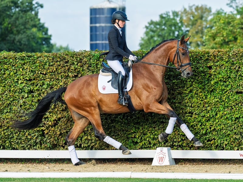 Dieser Sohn des Valverde wurde schonend angeritten und an seine Aufgaben als Dressurpferd herangeführt. Mit viel Ausdruck und Bewegungsstärke betritt dieser imposante Wallach nun das Auktionsparkett. Velesco F ist ein hochinteressantes Ausbildungspferd für den gehobenen Dressursport. 2. Generation Sportpferde: Westpoint 195 v. L' Espoir (DR M erfolgr.), First Choice F v. Feedback (DR M erfolgr.) 3. Generation gekörte Hengste: Time To Dance v. Trafalgar Sportpferde: Saltes TR v. Secret (DR M erfolgr.) Stutenstamm gekörte Hengste: Donarlicht v. De Niro (DR int. Grand Prix erfolgr.), Donar Weiss v. GGF v. De Niro (DR int. Grand Prix erfolgr.), Amascio v. Amateur I/T., Merano v. Maat I, Worthy Opponent v. Waikiki I, Don Rico v. Don Frederico Sportpferde: Belissa v. Belissimo M (DR int. PSG/Inter I/II erfolgr.), Rocero SVS v. Rotspon (DR int. PSG/Inter I erfolgr.), De Facto 2 v. Direktor (DR PSG erfolgr.), Allegro 132 v. Aktuell (DR M erfolgr.), Gerona v. Graf Grannus (SPR int. 1,60 m erfolgr.) Mutter: HannPr Soraja ZL: 4/4 Turniererfolge: RPF: 4/1. 1/2. 4/3. 2/4. Großmutter: VbPr Wellness ZSP: 7.58