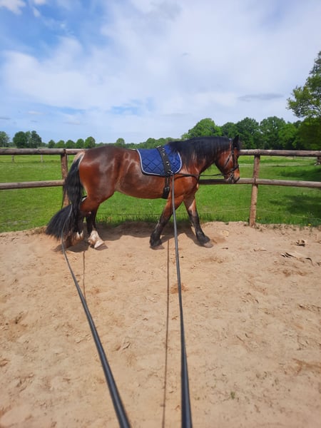 Helaas moet ik om persoonlijke redenen afstand doen van mijn paard Fips: Fips is een 9-jarige Rijnisch-Duitse koudbloed ruin met een stokmaat van ongeveer 1,74 m. Hij is voor een koudbloed vrij sportief en beweegt zich eerder “lichtvoetig” met mooie, vloeiende gangen. Zijn “Go” ervaar ik tijdens het rijden als zeer prettig, niet te voorwaarts noch te lui. 😊 In de omgang met mensen is hij heel open en staat hij graag overal bij. Hij is niet de grootste knuffelaar, maar hij is dol op knuffels van de mens of het samen verzorgen van de vacht met soortgenoten. In de kudde is hij goed te combineren met zowel hengsten als merries. Hij springt niet op. Hij voelt zich het best wanneer hij een eerlijke leider of leidster heeft, waar hij zich aan kan optrekken. Ik zou voor hem een kleine kudde van ongeveer 4-6 paarden wensen. Met deze grootte hebben wij de beste ervaringen; grote kuddes met frequente wisselingen van paarden passen niet zo goed bij hem. Fips is bereden in stap en draf, met galop zijn we begonnen, maar daar is nog oefening voor nodig. Daarnaast wordt hij aan de longe en dubbele longe getraind (alle gangen) en wordt er gymnastische werk vanaf de grond en onder het zadel gedaan. Bij nieuwe taken of in onbekende omgeving heeft hij soms even de tijd nodig om zich aan te passen, maar met rust en vertrouwen pakt hij ook nieuwe situaties heel goed op. We zijn af en toe op een cursus geweest (stangenrijden en rustgevendheid), waar hij het heel goed deed. Tijdens een winter ben ik regelmatig alleen met hem naar een lokale rijvereniging gereden voor dressuurtraining in de rijhal; het laden gaat probleemloos en hij blijft rustig wachten als hij even op de trailer moet wachten. Voor beginners of herintreders is hij echter niet geschikt, omdat hij een ervaren begeleider nodig heeft die hem mentaal en fysiek op een goede en regelmatige wijze ondersteunt. Gezondheid: Fips heeft een chronische darmontsteking die goed te behandelen is. Graag vertel ik hier meer over als er interesse is. Zijn hoefsmid komt elke 6-8 weken, hij wordt bij mij barefoot gereden. Zijn tanden worden regelmatig gecontroleerd en voor het laatst in juli van dit jaar (07/25) gevijld. De vaccinaties (tetanus, griep en herpes) zijn up-to-date. Voeding: Fips verdraagt kwalitatief hoogwaardig, vrij droge hooi- en ruwvoeder, evenals de meeste in de handel verkrijgbare voeder- en supplementen. Zo veel mogelijk weidegang is echter het beste voor hem; hij heeft GEEN problemen met hoefbevangenheid of overgewicht. Accessoires: De uitrusting wordt op verzoek mee verkocht, waaronder regendekens, winterdekens, vliegen-dekens, zweetdekens, halsters, bitringen, bit en meer. Een passende dressuurzadel (18 inch zitvlak, stangloos verstelbaar) kan voor €1.200,- VB worden overgenomen. Kennismaken en proefritten zijn mogelijk na afspraak. Ook beantwoord ik graag persoonlijk diverse vragen. Ik kijk uit naar serieuze interesse. 😊