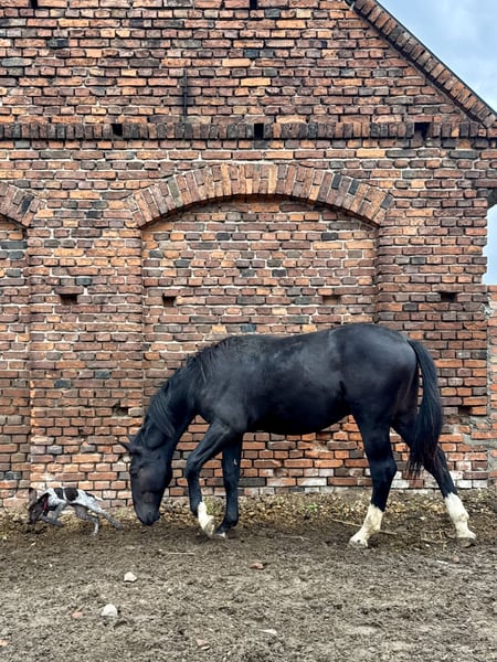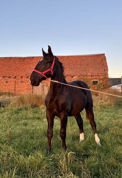 Silesian stallion, one and a half years old. Very friendly and curious. Always approaches people in the paddock. Daily turnout. Beautiful coat color - 3 socks and a star on the forehead. Unique sheep nose. Regularly trimmed. Current height: 155 cm. Will be a tall horse. I will send videos via SMS/WhatsApp. Father is in the second to last photo and mother is in the last one. Father's height is 165 cm. Mother is 168 cm.