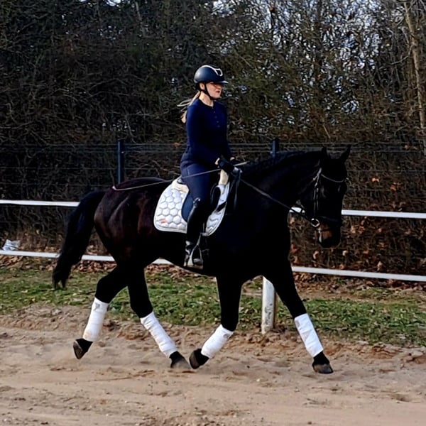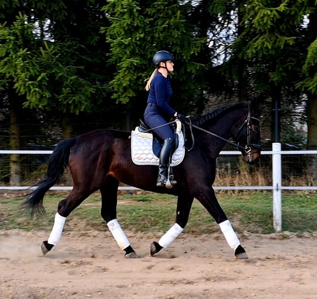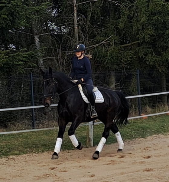 Afrodyta – Schlesian mare with full pedigree and main studbook registration 4 years old, 16.1 hh (168 cm) tall. She is a beautiful Schlesian mare, born in 2022. With her elegant dark coat and a height of 168 cm, she is not only a striking appearance but also a lovely dressage horse. She is also trained to drive and has been driven in a two-in-hand. This mare is characterized by her friendly and outgoing nature. She is well-behaved, easy to handle, and familiar with dogs and cats. Her movements are supple and expressive. A great leisure horse. The mare is healthy, barefoot, and herd-friendly. If you are interested or have further questions, please feel free to contact me. Visits and trial rides are possible by arrangement.