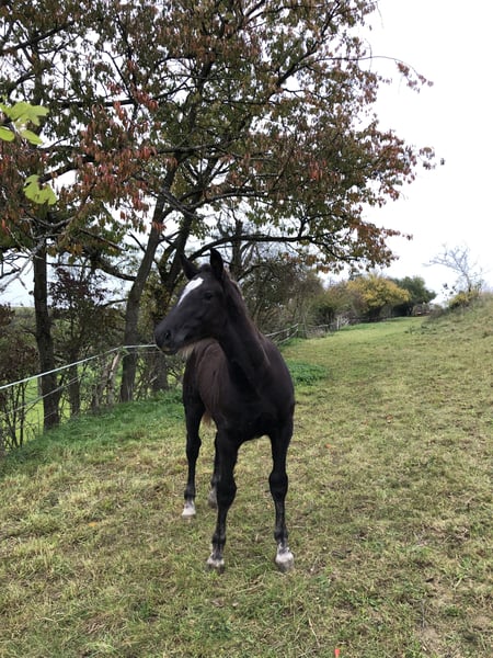 Pouliche gelding de couleur chestnut foncé, issue de Vinzent et de la jument gagnante Elli (exposition nationale de Marbach 2022). Très expressive en mouvement, avec une démarche correcte et doté d’un caractère exceptionnel. Volker connaît parfaitement le langage des jeunes chevaux, il est bien élevé en main et se montre très sociable avec les humains.