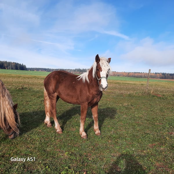 For sale: young Black Forest chestnut mare – perfect for leisure riding! Born in 2024, this charming mare offers great potential and brings joy to everyday riding. She is ideally suited for those seeking a reliable and affectionate horse. She is very curious and eager to learn. Please feel free to contact me for more information or to arrange a viewing.