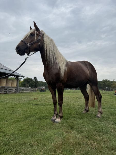 Our sweet Lilly (sired by Maurice, out of Wilddieb) is looking for a new home because her dad is also with us. We have started the process of breaking her to saddle, and she is doing this very well; she knows the saddle, bit, and bridle, but we are still working on her gaits. She is very well-behaved on the trailer and walks along everywhere. Her father is with us and can also be seen.