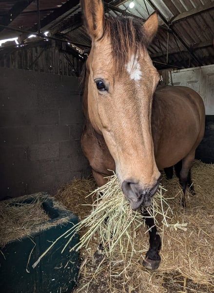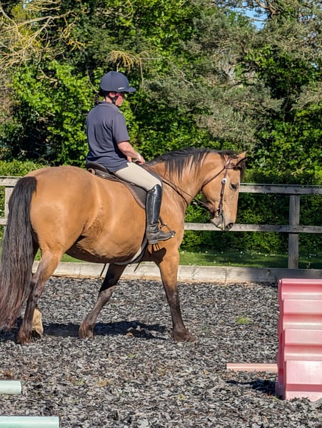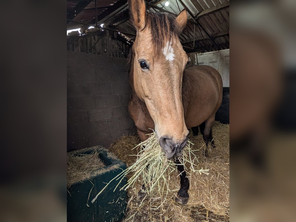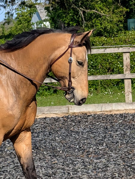 "Angel of the High Woods" or Angie for short is a 15yr old beautiful bucksin mare. She is a cross between a Selle Francais and a Normandy Cob from the Elevage Jouvin family in Normandy. As such she has the strength and gentle character of the Normandy and the spirit and beauty of the Selle Francaise. Despite being 15 and well broken in; she only has the mileage of a 6 year old and while knowing the basics is rather green. That said she learns quickly and having been brought back into work just recently is progressing well. However she has a strong opinion and needs firm but gentle guiding and instruction from a confident rider which I am not, hence the reason for my reluctant sale. She is not spooked by anything - chickens, goats, cattle, diggers, tractors, dogs, cars not an issue. Loads impeccably, stands to be washed and feet done. Lives on fresh air - literally grass and hay and the odd carrot. Currently barefoot but has been shod in the past I believe but her hooves are in excellent condition. Her colour is beautiful with a dark buckskin dapple appearing now in her summer coat. Her movement is lovely and very comfy to ride. She has lived out all her life in large herd and currently is out daytimes and stabled at night. Middle ranking in the herd currently with a gelding and a mare. Lovely gentle sweet nature on the ground, loves a good scratch and being groomed. Great out on the trail and has popped over a small jump recently. Being buckskin she would make an excellent western trail horse. She has had a western saddle on and has had a little schooling in western that could be continued. Up to date with shots and worming. Teeth good and recently had her back checked and has no issues.