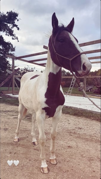 Okalina du Valdor Pie mare – Selle Français 2 years old, will turn 3 in 2027 By TypTop du Monteil and out of Fébus d'Olympe, her expected height is around 165 cm. Okalina is a gentle mare with a sound mind; she is curious, affectionate, playful, and more! Groundwork, grooming, and handling all four feet are well established! Okalina will be an ideal mare for an amateur rider looking to bring along a young horse and train it at their own pace! She has a calm temperament and the bloodlines to perform; she has already encountered some small jumps, showing herself to be very honest and willing, without hesitation, with a very good back passage! More videos and photos available upon request. Price: €5,600 🥕 Serious inquiries only, please.