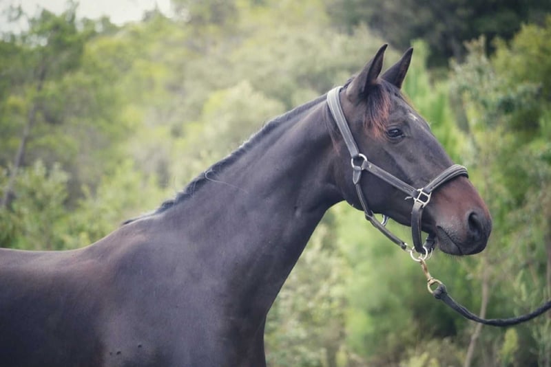 Nespola is a young 2-year-old dark bay mare, carefully bred from a cross between Glamourdale, the World Dressage Champion, and a Lusitanian mare by Kazan du Coussoul. Combining strength, elegance, spirit, and intelligence, she has a harmonious build, a good temperament, and a high learning capacity. Promising and charismatic, she would be an excellent choice for an ambitious competitive project or a rider seeking a versatile and refined horse.