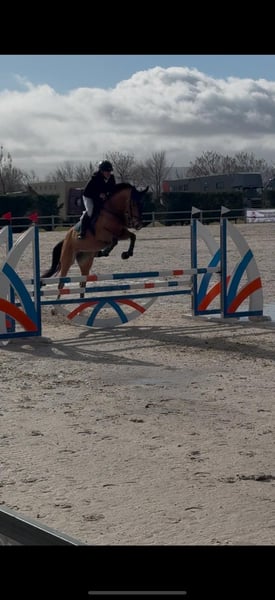 Late mare, unbroken as of June 2025. Has competed up to 110 cm in national competitions both indoors and outdoors. Has a friendly demeanor and is very easy to handle. Still lacks some experience and is somewhat green. She tolerates all grooming, shoeing, veterinary treatments, and is good in paddocks, pastures, and on the walker. Very calm in the field and performs well in the arena, even among other horses. She started her training late because she was used as a broodmare in France due to her excellent lineage. Priced affordably due to overstocking in the stable.
