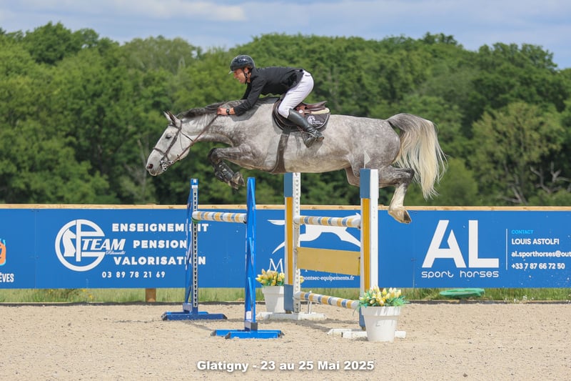 Igwenta du Gué, élégante jument grise de 8 ans, toisant environ 170 cm, née à l’élevage et suivie depuis sa naissance. Issue d’un croisement performant : Par Very Good de la Bonn (ISO 153) Et Tulipe de Chap (ISO 138) par Ogrion des Champs × Quick Star Une génétique alliant force, respect et mental de compétitrice. 🏆 Parcours sportif Débourrée hiver de ses 5 ans Petite saison de CL à 6 ans Évolue actuellement sur 125 / 130 cm Montre un réel potentiel pour 135 / 140 cm Jument avec du cadre, de l’équilibre et une très belle trajectoire. Respectueuse, appliquée, elle peut observer son environnement mais devient franche et guerrière à l’obstacle. 🧠 Mental & Utilisation Igwenta est une jument avec du sang, sérieuse dans le travail. Elle conviendra parfaitement : À un amateur éclairé souhaitant évoluer vers 135 À un professionnel pour valorisation et projection 140 Part en balade, voyage en van, vit aussi bien en box, paddock ou pré. Pieds nus. 📍 Informations Visible en Moselle, proche Metz Budget : supérieur à 30 000 € Jument d’avenir, à finir de construire, avec un vrai papier et un potentiel sérieux pour cavalier ambitieux.