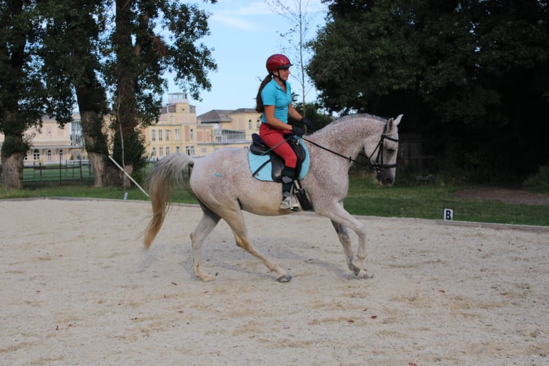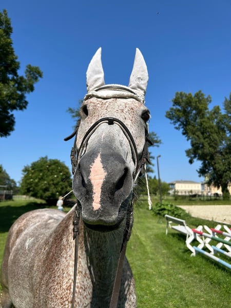 Unser einäugiger Bandit, liebevoll Bo genannt sucht seinen Lebensmenschen. Er kam als Schulpferd zu uns, fühlt sich aber mit dieser Aufgabe nicht wohl. Bo war ein talentiertes Distanzpferd, sogar international gestartet, holte auch über 80 km den burgenländischen Meistertitel. Er hat im Gelände einen angenehmen Vorwärtsdrang und sehr bequeme Gänge, ist aber für Anfänger nicht geeignet, da er gelegentlich zwei bis drei Galoppsprünge einbaut, was einschüchternd wirken kann. Charakterlich ist er ein Traum, ein verschmuster Wallach, unkompliziert, schmiede- und verladefromm, absolut verkehrssicher, derzeit barhuf. Wir haben das Gefühl, dass ihm der Trubel in Wien zu viel ist, und er eine Bezugsperson braucht. Obwohl ihn seine Einäugigkeit nicht beeinträchtigt, er macht alles problemlos mit, auch Stangentraining und Springen, muss er seinem Reiter vertrauen können. Der Reiter muss ihm Sicherheit geben können und das ist im Schulbetrieb mit Anfängern nicht möglich. Aufgrund des finanziellen Drucks im Schulbetrieb, müssen wir Bo leider abgeben.