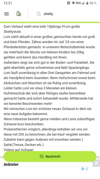 Loni liebt es auszureiten und ist stets mutig und fleißig. Lässt sich in allen drei Gangarten reiten und kennt Longieren,sowie sämtliche Freiarbeit. In der Abteilung reiten kennt sie ebenfalls. Wäre auch als Reitschulpony tauglich. Sie hat natürlich auch Shetty Flausen im Kopf, wie betteln nach Futter und mal n sturen Moment. Aber generell lässt die sich immer wieder überzeugen. Sie hängt ihr Herz eher an eine Person. Und ist dann schnell eingespielt.