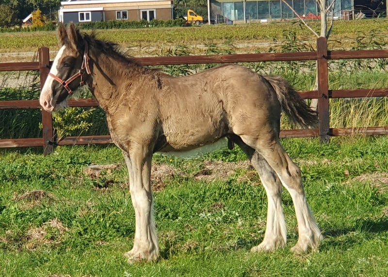 Bartelshoeve Eros is a sweet, playful, and social Shire foal. He is raised with other horses and is accustomed to being outside as well as being stabled indoors. He has a beautiful black coat with 3.5 white legs and a distinctive blaze. Eros is vaccinated, dewormed, and has received farrier care. His pedigree includes Earl Stables Casanova x Bartelshoeve Jolien, representing a refined and pure bloodline, which also makes him an interesting prospect for future breeding. He holds a Shire passport registered with the British studbook. We are looking for a forever loving and serious home for this adorable boy. If you are genuinely interested, please contact Liselot Deurloo at avanvossen77@gmail.com or via WhatsApp at 06-42081233.