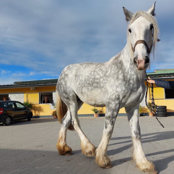✨ Elegant Shire Mare – Perfect for Leisure Riding ✨ For sale is a beautiful Shire Horse mare, born in 2014. This impressive grey mare stands at an imposing height of 1.87 m and has a majestic presence. She impresses with her gentle, calm nature and is ideally suited for leisure riding — whether for relaxed hacks, walks, or simply enjoying quality time in the countryside. She is friendly, well-mannered, and enjoys human contact. Due to her age, we are now looking for a caring home where she can find peace and enjoy her life in a loving environment. She is being offered with a protection certificate and at a special price of €900 instead of €5,900. It is important to us that she goes to responsible owners who will appreciate and care for her. This exceptional mare is a true heart horse — perfect for those seeking a large, gentle Shire and looking for a reliable, honest leisure partner.