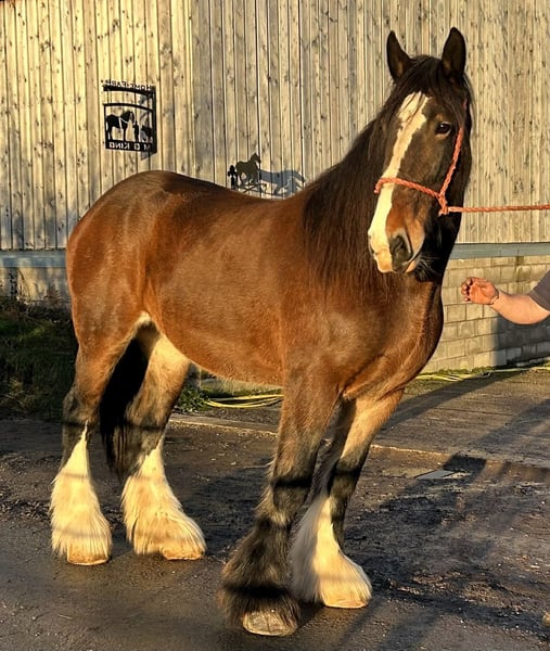 This beautiful traditional type Shire mare has bred some really good foals. She is well made and sturdy and should continue as a brood mare - or - with her lovely temperament make a very nice riding mare. Good to wash, load , with her feet, loves people and is good with other horses. Sheila@shiresandclydesdales.com WhatsApp 07909 932352 0044 1606 883869 07919 605350 UK and worldwide Shire horses for sale and Clydesdale horses for sale - from the home of champions.