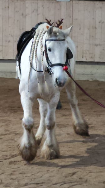Te koop zoals in een sprookje: een betoverende schimmel Shire Horse merrie! Deze elegante schimmel merrie werd geboren in 2010 en maakt indruk door haar prachtige verschijning. Ze heeft een vriendelijke maar voorzichtige aard. Tegenover vreemden is ze erg wantrouwig. Je moet haar vertrouwen verdienen. Het moet waard zijn dat ze je accepteert. Het is belangrijk dat jij haar veiligheid biedt. Alles wat nieuw of anders is, wordt aangeprust. Tijdens het rijden kan ze dan ook snel onrustig worden als ze zich onzeker of ongemakkelijk voelt. Blijf kalm en laat haar voelen dat alles in orde is. Met een stokmaat van 176 cm behoort ze tot de middelgrote Shire Horses. Door haar bredere, klassieke barokke bouw lijkt ze imposanter en zou ze mogelijk ook geschikt zijn voor koetswerk. Ze is goed getraind, maar heeft toch een ervaren ruiter nodig. Ze kent zowel boxen- als weidegang. Het rijden met de trailer is geen probleem voor haar. De hoefsmid wordt volledig geaccepteerd, net als de dierenarts. Als fokmerrie was ze een geweldige moeder. Ze heeft veel aandacht en een vriendelijke persoon nodig. Bij interesse horen we graag van u!